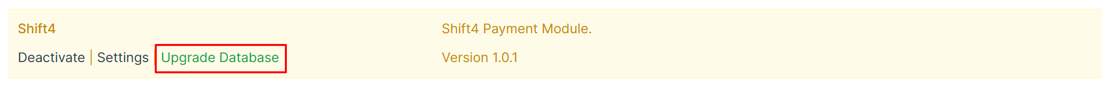Once the module is installed and activated, you'll see two options, Deactivate and Settings. Click on the Settings button to quickly access the Shift4 Payment Gateway