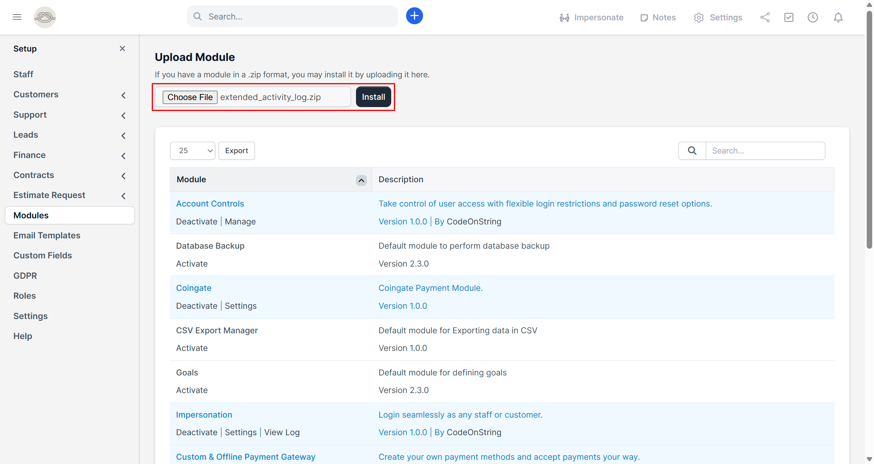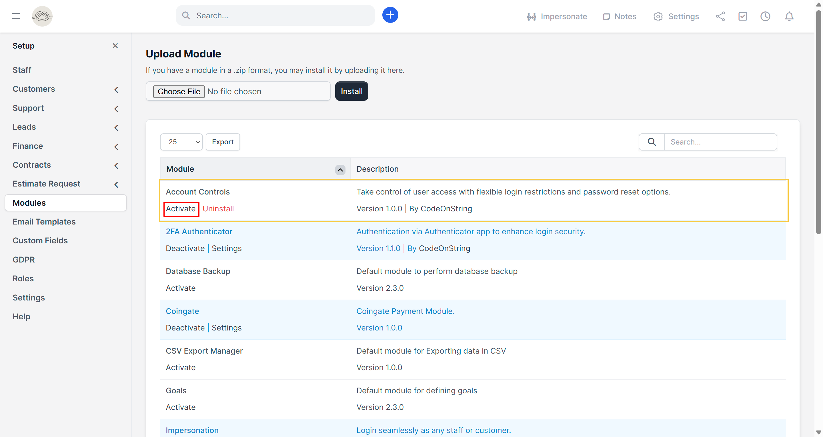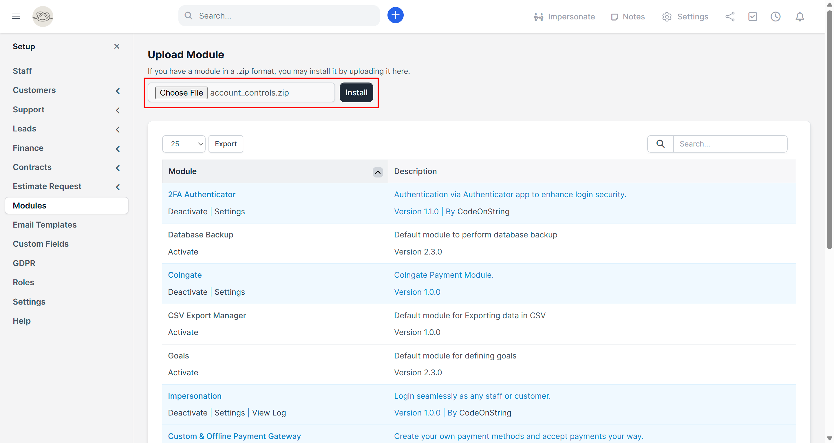 - Log in to the Perfex CRM admin panel as an administrator and go to Setup → Modules.