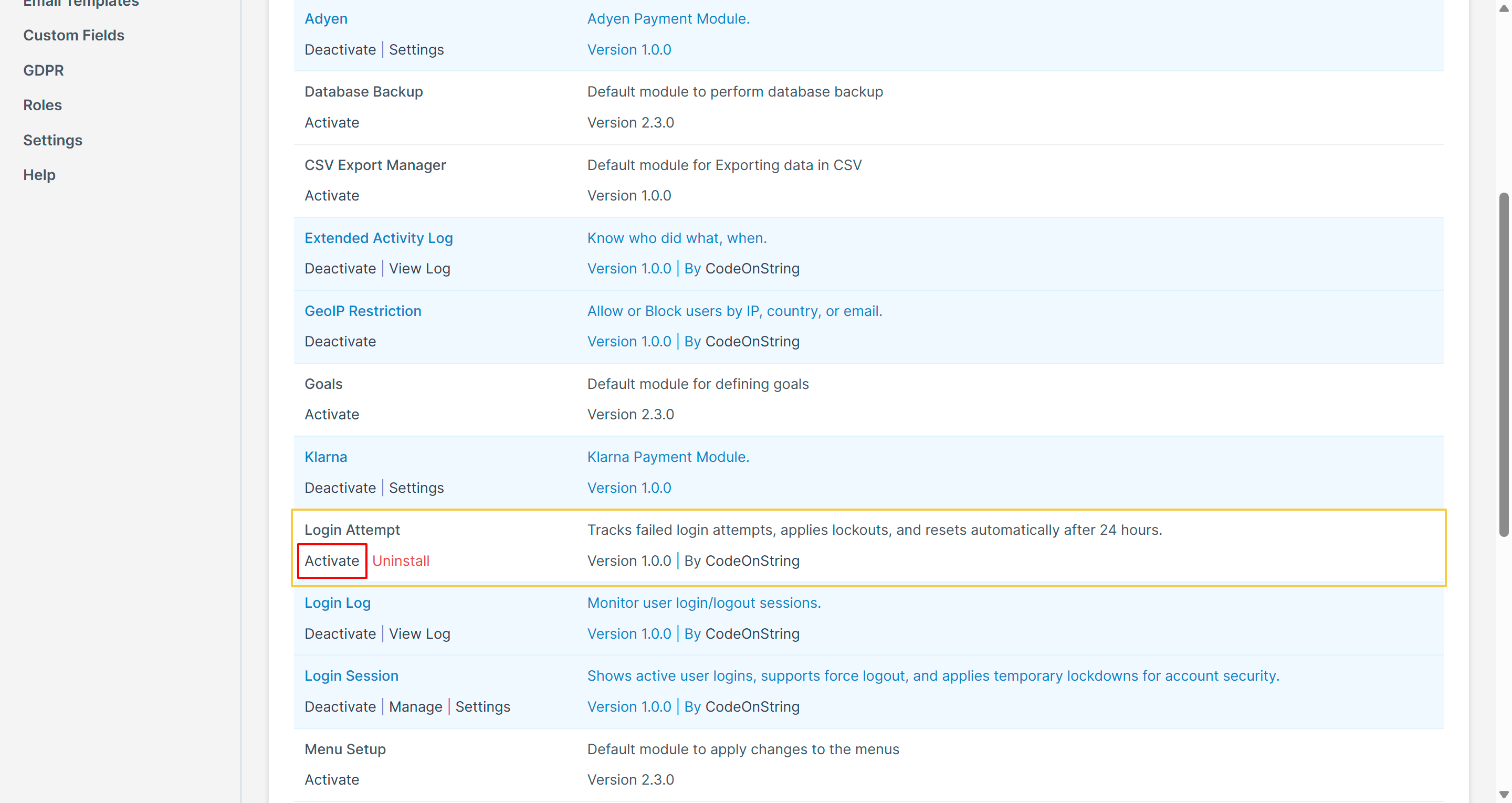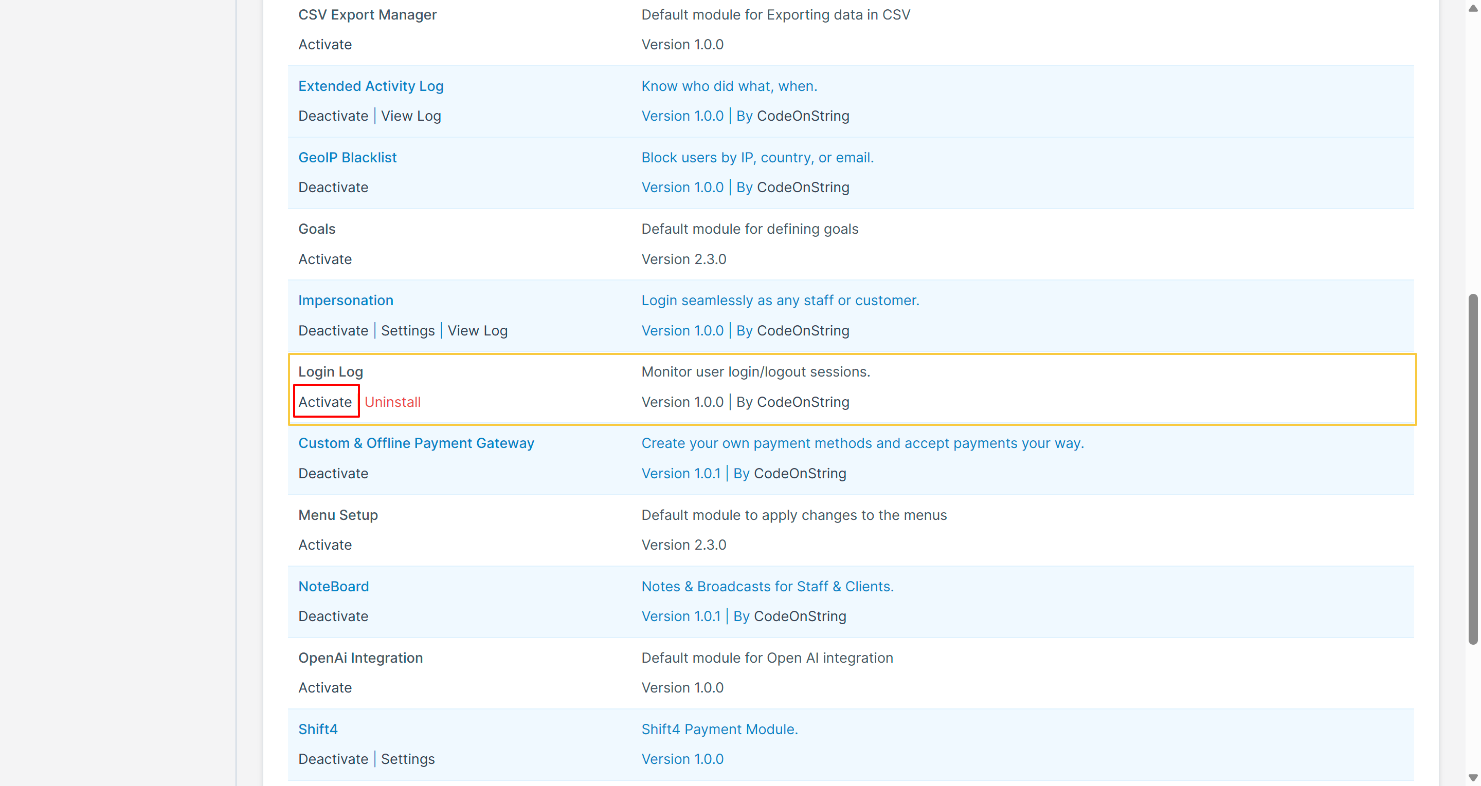 Once the module is installed, it will appear in the list of available modules below. Simply click the Activate button to enable it.
