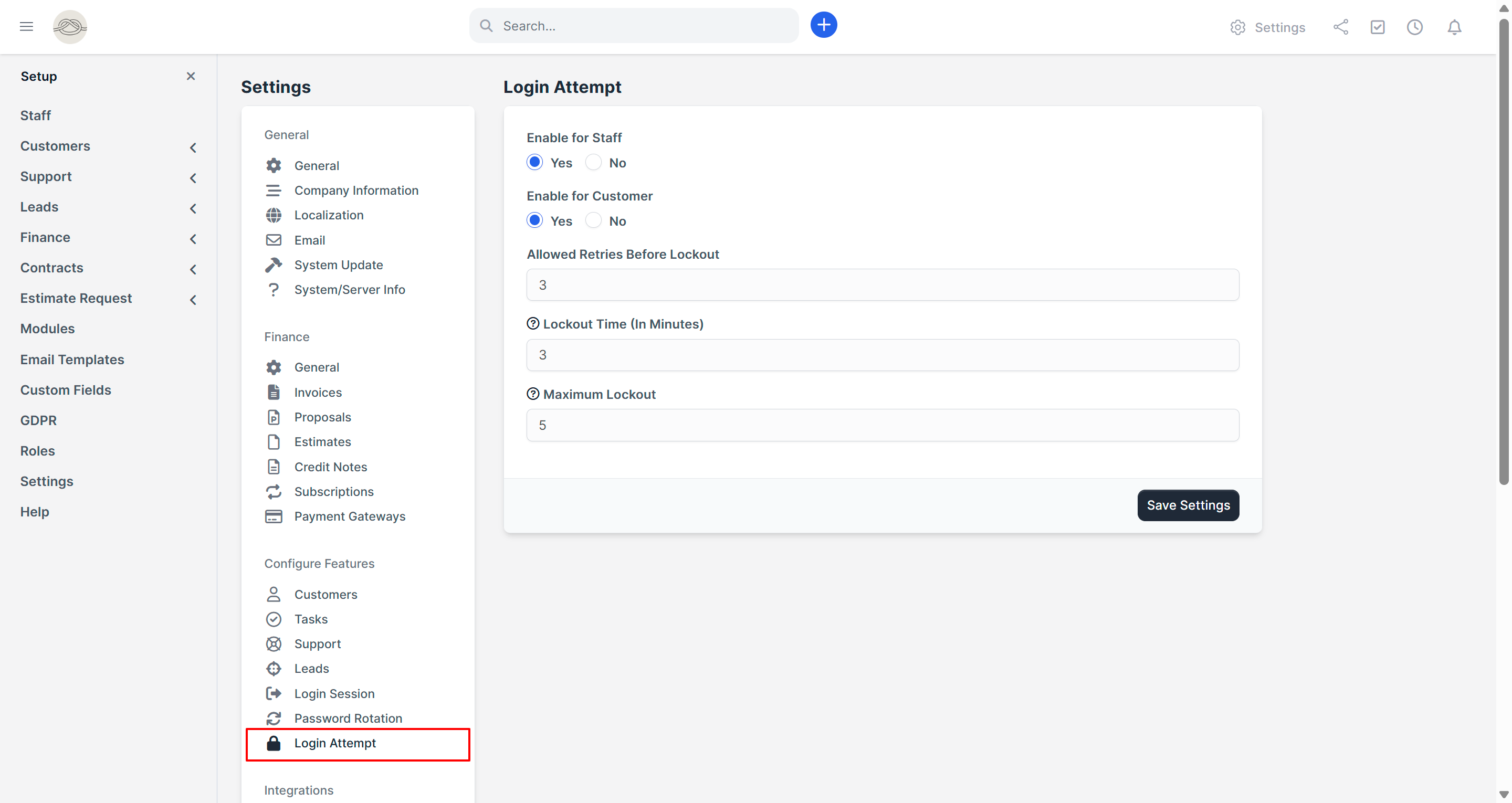 Alternatively, you can navigate to Setup → Settings → Login Attempt to access its configuration options, which include :