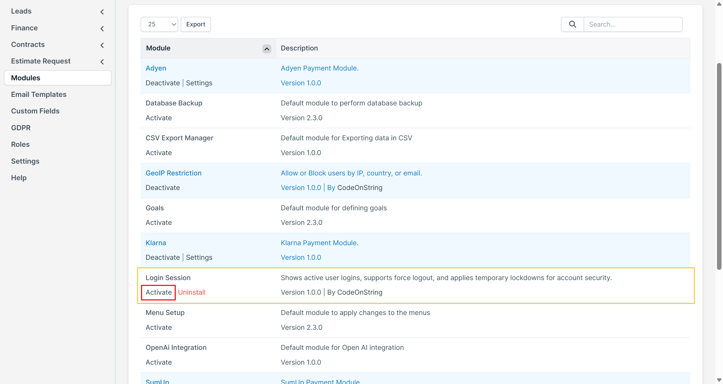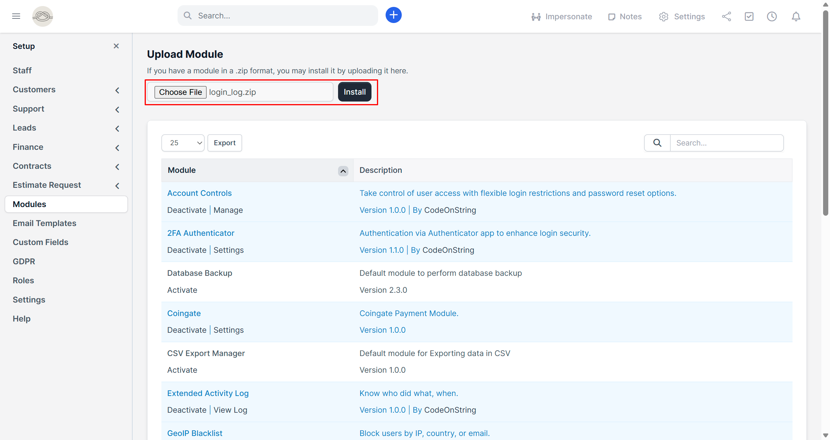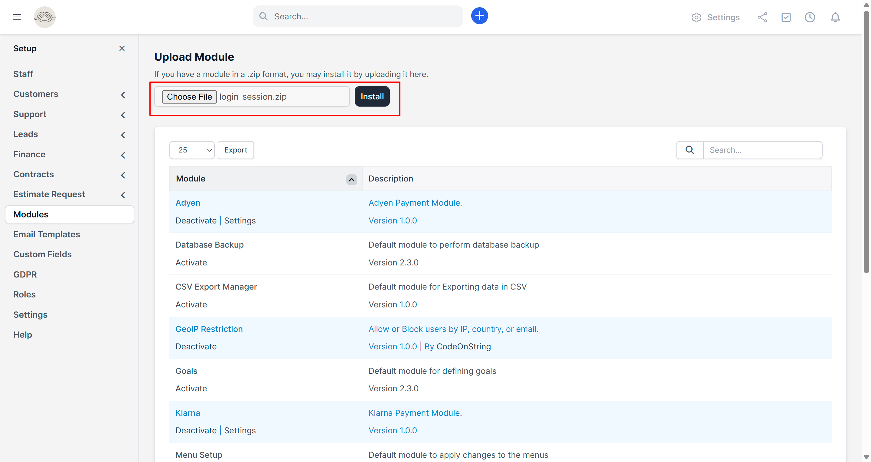 - Log in to the Perfex CRM admin panel as an administrator and go to Setup → Modules.