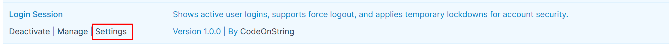 Once the module is installed and activated, you'll see three options, Deactivate, Manage and Settings. Click on the Settings button to quickly access the Login Session Settings