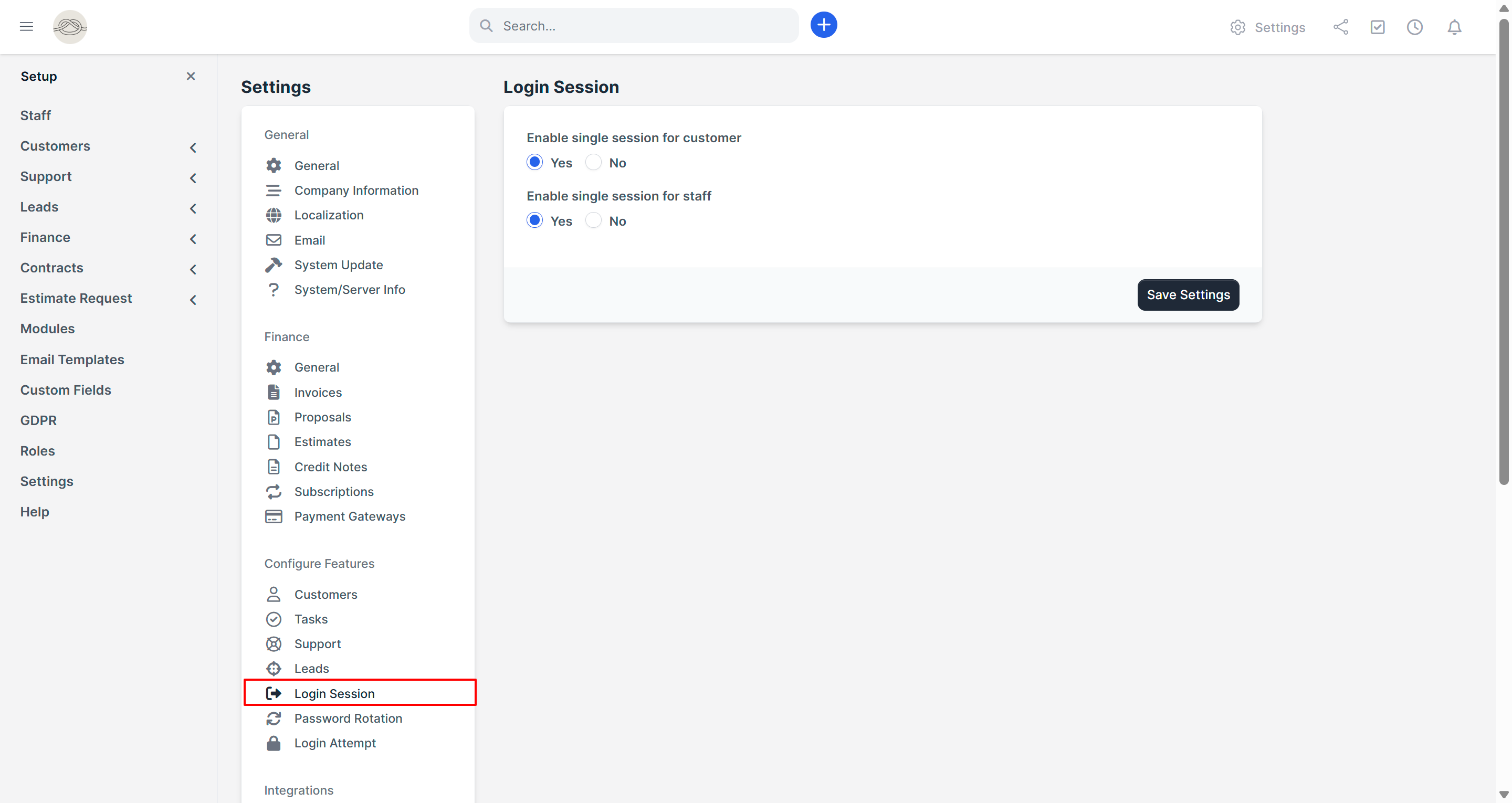 Alternatively, you can navigate to Setup → Settings → Login Session to access its configuration options, which include :