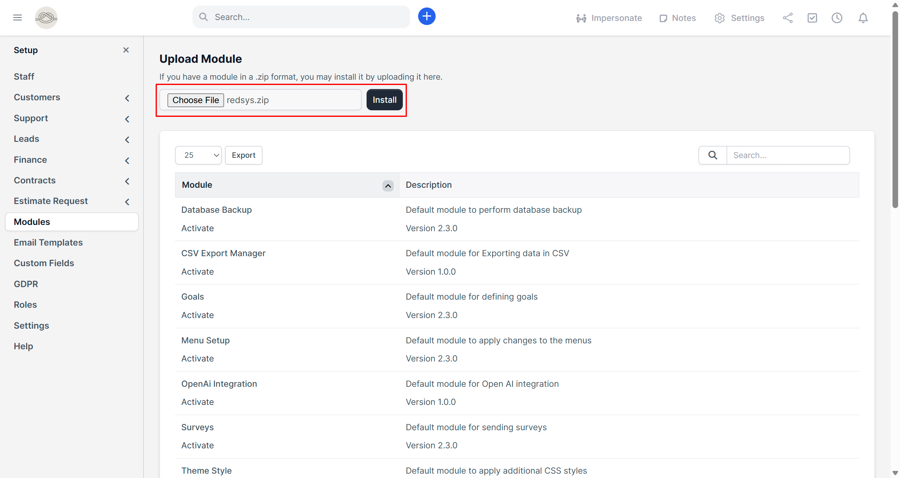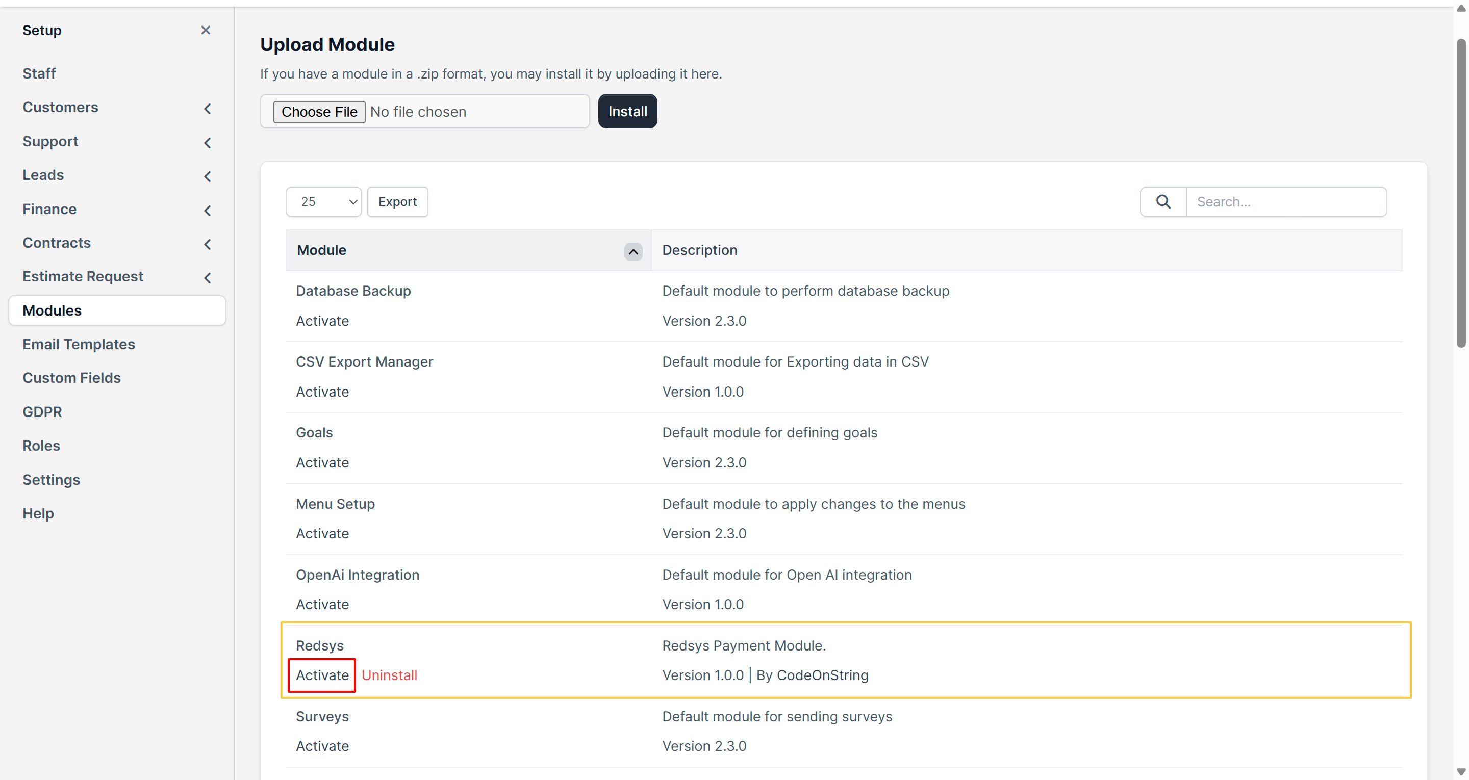 - Log in to the Perfex CRM admin panel as an administrator and go to Setup → Modules.