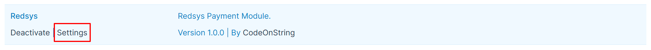 Once the module is installed and activated, you'll see two options, Deactivate and Settings. Click on the Settings button to quickly access the Redsys Payment Gateway