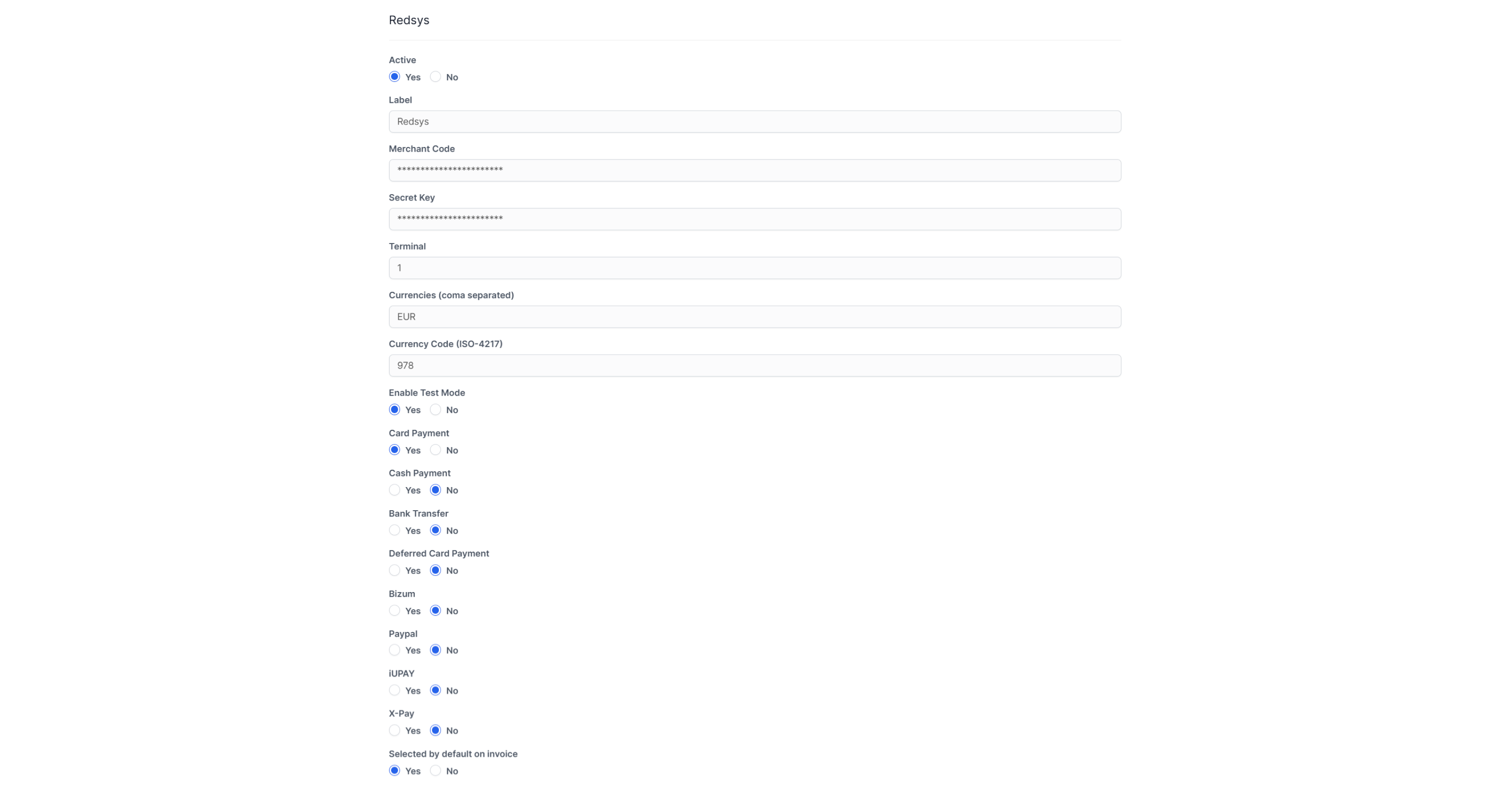 Alternatively, you can navigate to Setup → Settings → Payment Gateways and click on Redsys to access its configuration options, which include :
