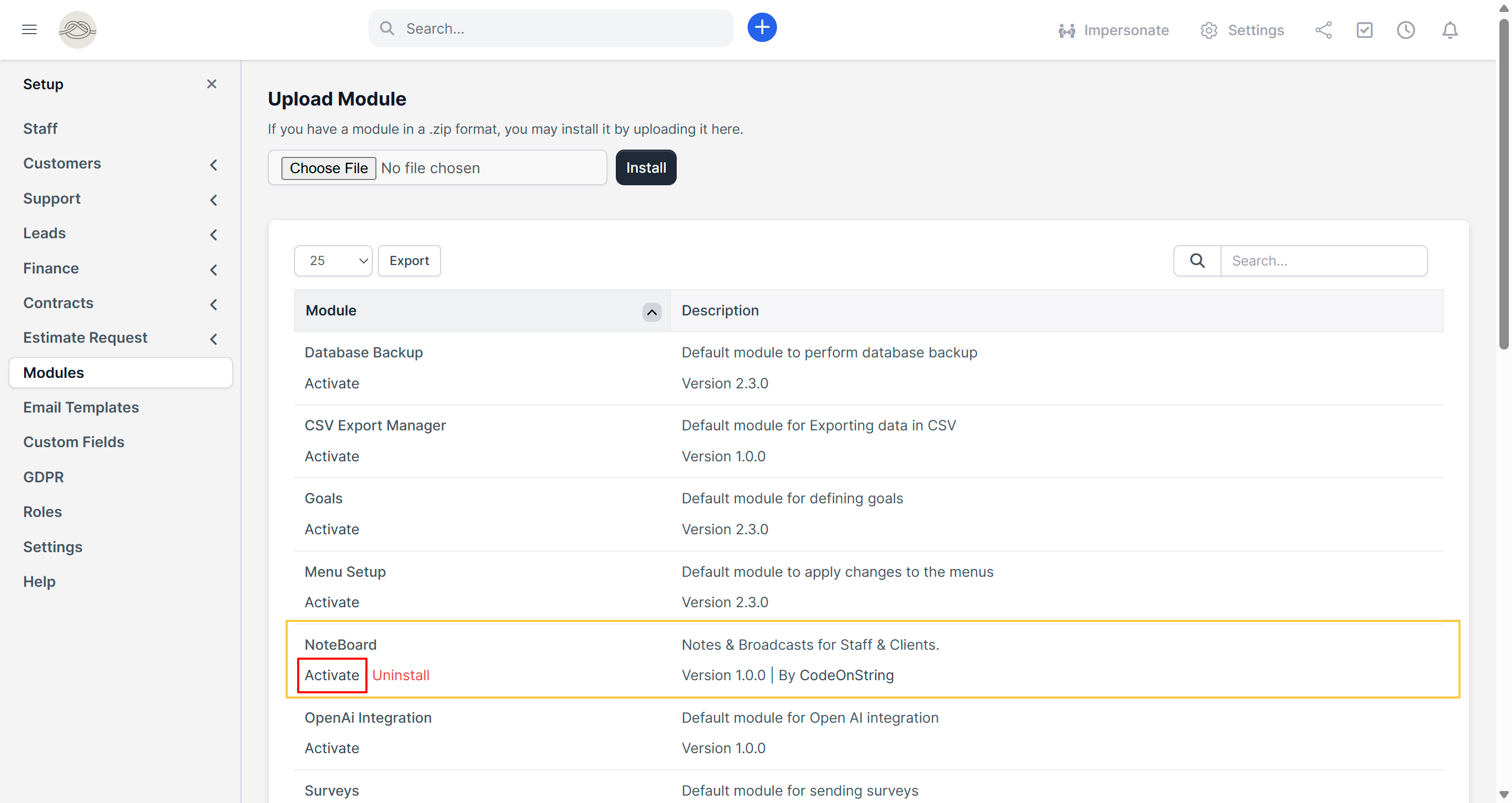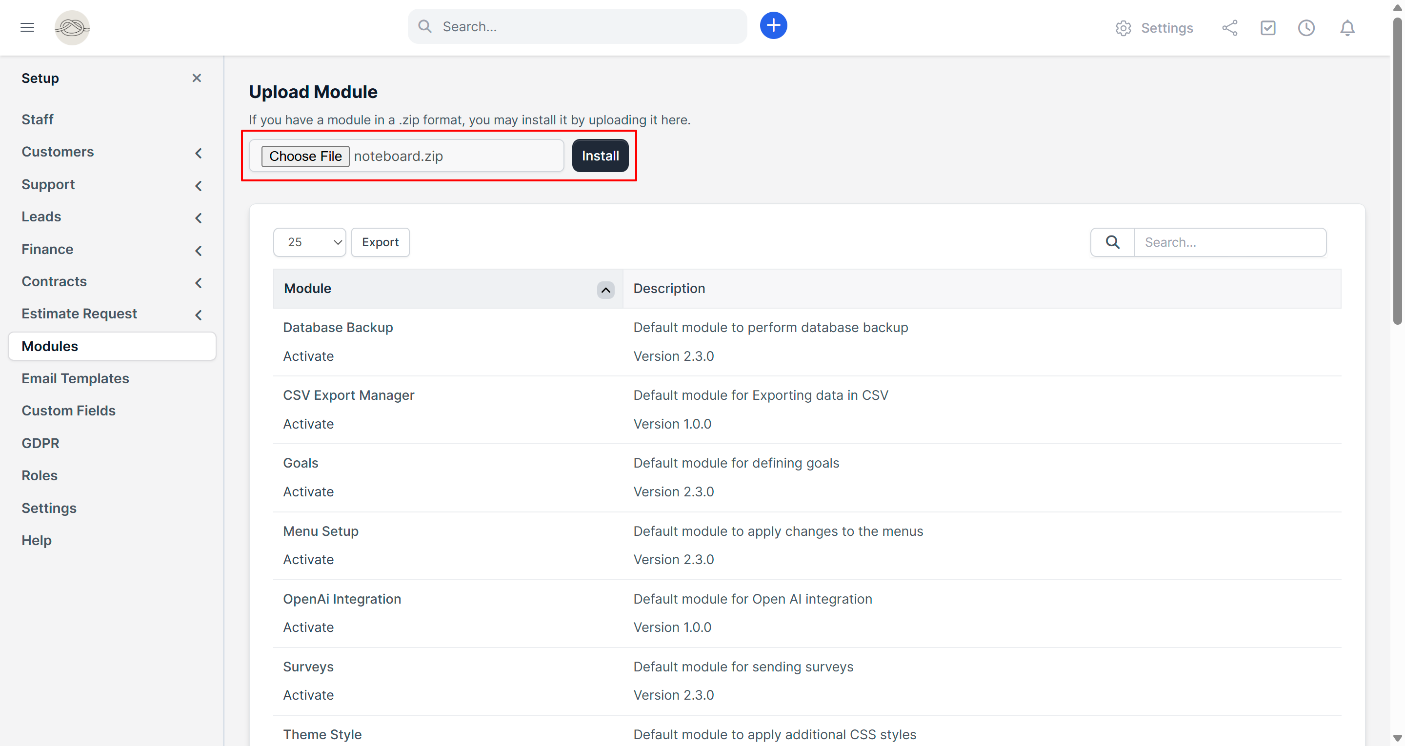 - Log in to the Perfex CRM admin panel as an administrator and go to Setup → Modules.