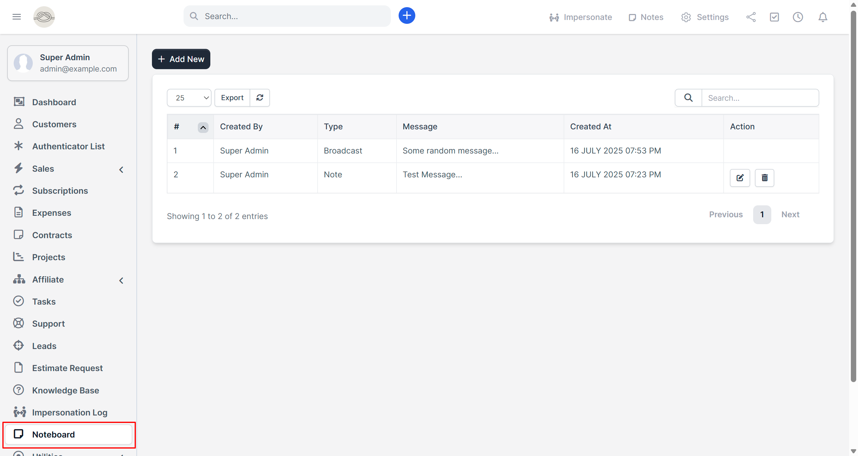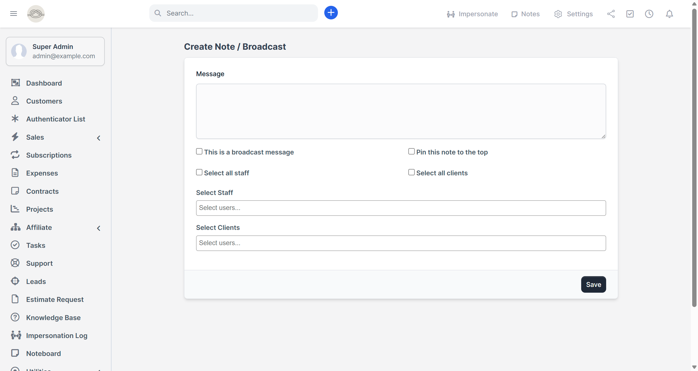 This documentation provides complete guidance on the installation, configuration, and usage of the NoteBoard Module for Perfex CRM. This module allows authorized staff members to create and manage internal notes or broadcast messages for selected staff and customers within the system.