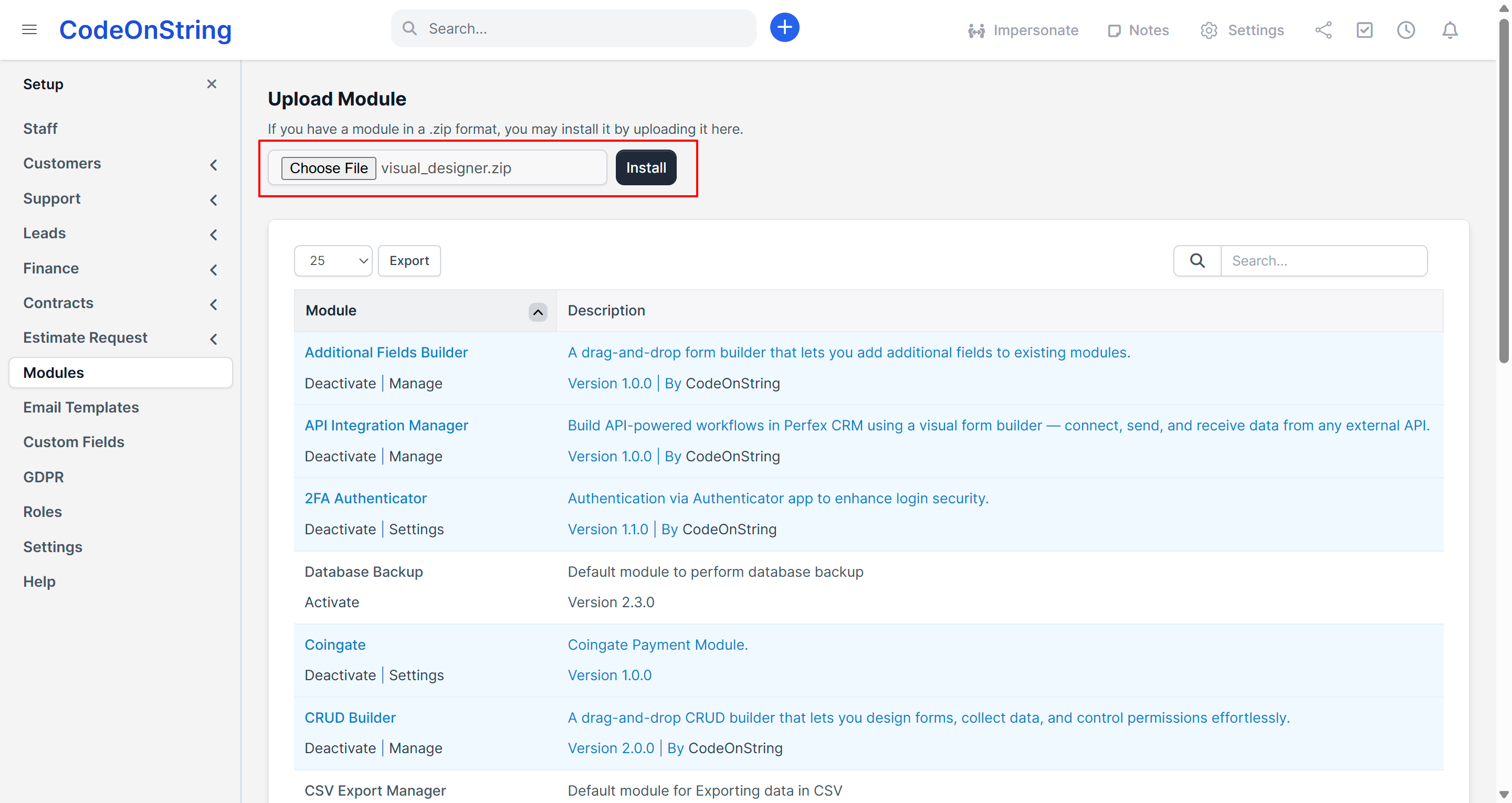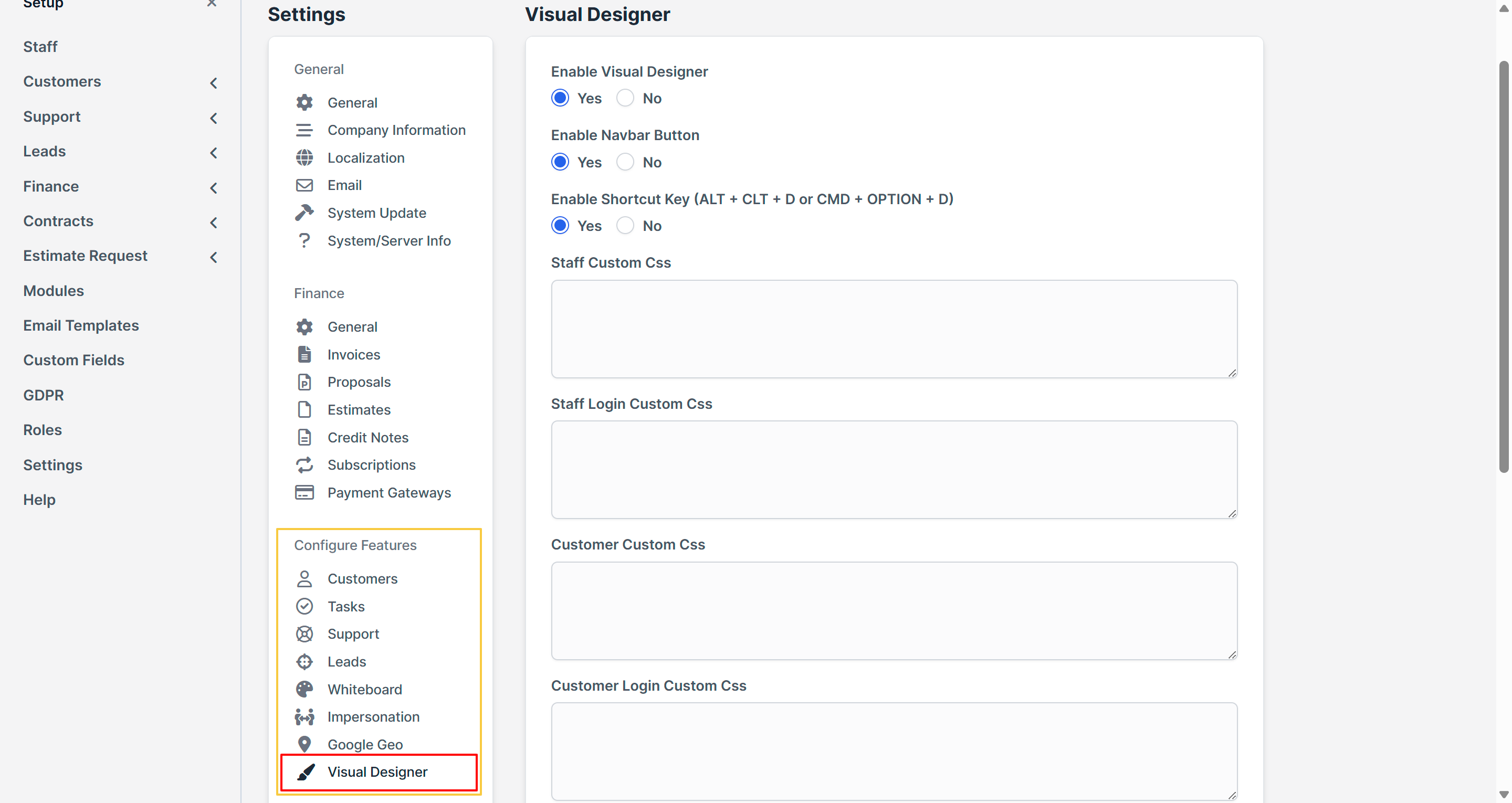 Once the Perfex Visual Designer module is installed and activated, follow the steps below to customize the CRM interface: