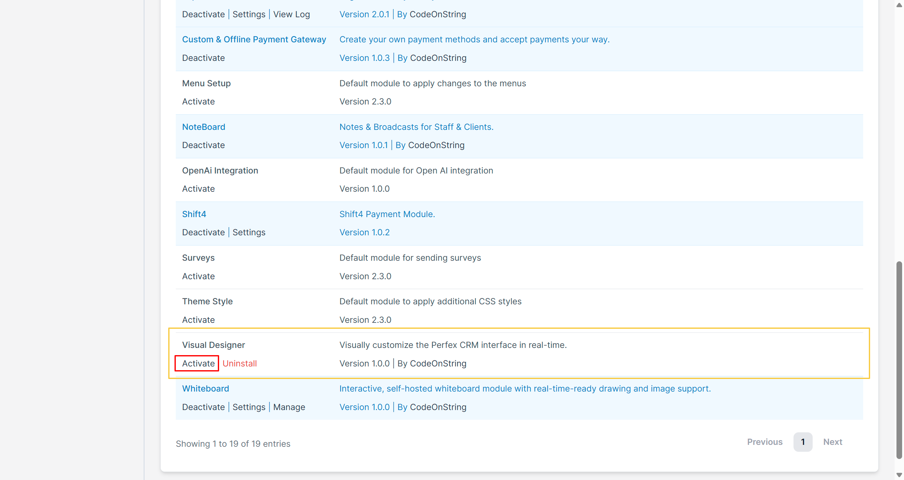 Once the module is installed, it will appear in the list of available modules below. Simply click the Activate button to enable it.