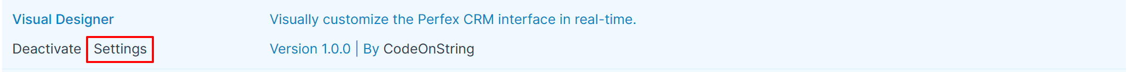 Once the module is installed and activated, you'll see three options, Deactivate, Settings. Click on the Settings button to quickly access the Visual Designer Settings
